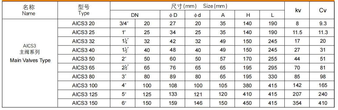 The degree of opening of AICS3 valves is function of the differential pressure between the inlet and outlet, so if the pressure difference is Dp = 0.3 bar, the main valve will be fully open, and if it is Dp = 0.2 – 0.3 bar, the degree of opening will be correspondingly proportional to △p.